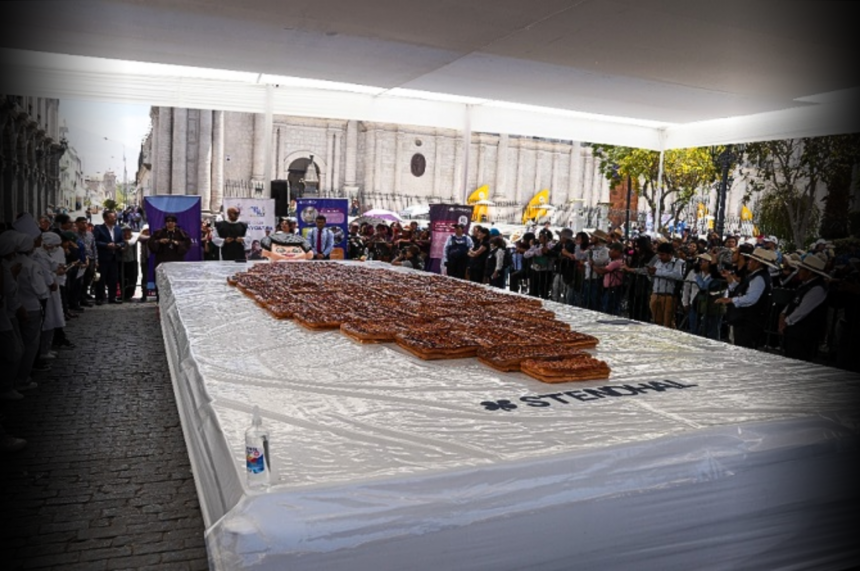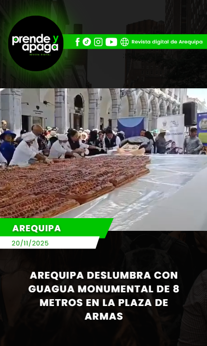 La tradicional guagua de pan sorprendió este año a los arequipeños con una imponente versión de 8 metros de largo y 3 metros de ancho, elaborada durante más de tres días por 20 estudiantes de panadería y pastelería del Instituto Stendhal. La presentación se realizó en la Plaza de Armas, ante decenas de curiosos que disfrutaron del evento.