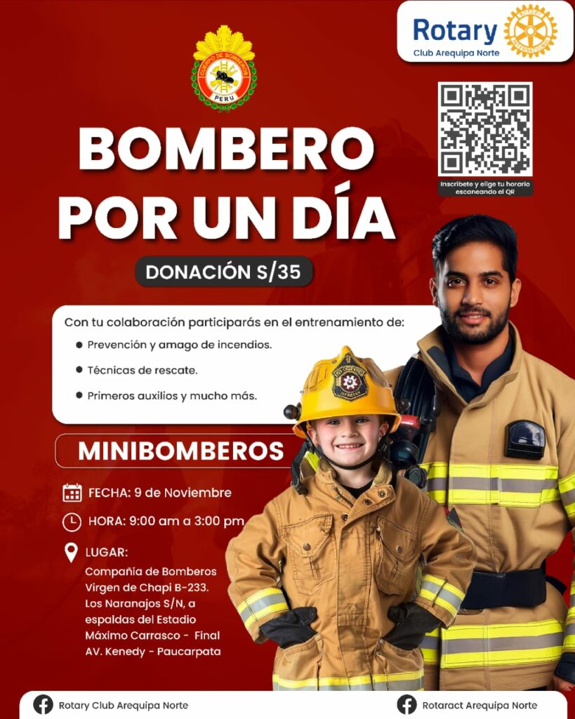 El Rotary Club Arequipa Norte, el Patronato Virgen de Chapi y la Compañía de Bomberos “Virgen de Chapi” N° 233 organizan el evento “Bombero por un Día”, una jornada formativa y recreativa dirigida a niños de 7 a 12 años, que busca fomentar el respeto y admiración hacia los Bomberos Voluntarios del Perú, al mismo tiempo que promueve la solidaridad ciudadana.
